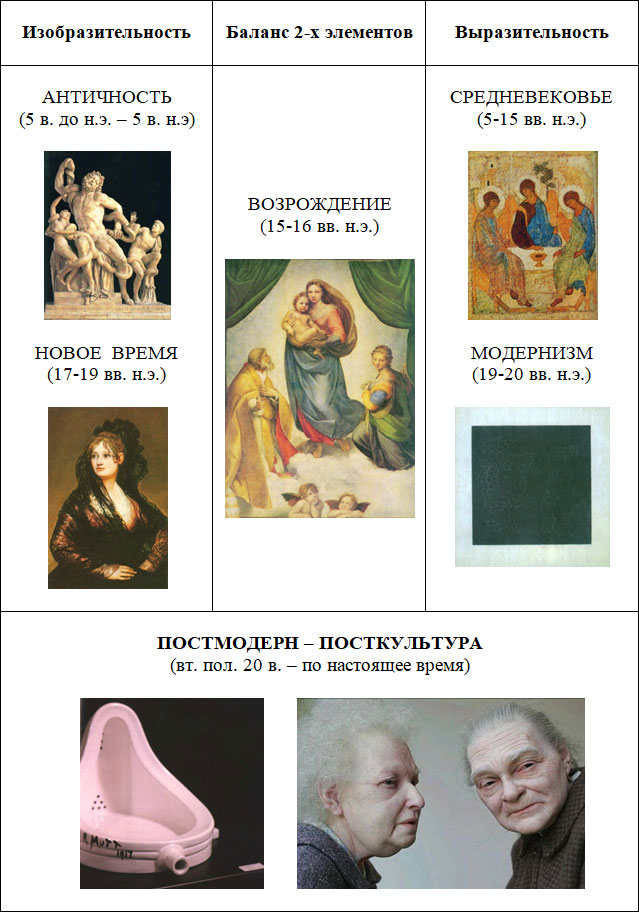 В эпоху Возрождения впервые и единственный раз в истории искусства был найден некий баланс между выразительностью и изобразительностью, поскольку переход от средневековой культуры к Новому времени вызвал «зависание маятника» между двумя доминантами. Работы ренессансных художников до сих пор являются для нас эталонами живописи, потому что в них знаковость и идейное наполнение сочетается с физиопластикой высокого художественного уровня. В конце XVI–XVII веков произошел очень важный, с точки зрения культуры, перелом, радикальный перелом – начался процесс разрушения мифологического и религиозного сознания под влиянием науки. В это время зарождается европейское естествознание, поэтому миф, который до этого все объединял и наполнял, делал все таким универсальным и гармоничным, начинает дробиться. В живописи наглядно видно, как изображение становится все более натуралистичным, очень близким к жизни и реальности. В период с XVII по XIX века изобразительность достигла своего апогея: художники научились до такой степени точно копировать действительность, что уже подошли к черте абсолютного иллюзионизма. И в этот момент появилась фотография, таким образом, техника реализовала идею крайней степени изобразительности. Изобретение фотоаппарата изменило отношение к искусству: художники почувствовали, что их усилия по копированию реальности обесценились, что и послужило одной из причин появления модернизма. Начиная с импрессионизма, художники стали стремиться разрушить предметность, разрушить фигуративность, и дошли до крайней точки абстракционизма, когда изобразительность полностью была отвергнута, и искусство объявили антимиметическим. Жирную точку в развитии изобразительности поставил Казимир Малевич, его «Чёрный квадрат» стал символом конца изобразительного искусства. В этом произведении важна не столько художественная, сколько культурологическая ценность, так как оно завершает длительный процесс развития изобразительности. Теперь, когда все средства художественной изобразительности были испробованы и израсходованы, наступила смерть искусства.