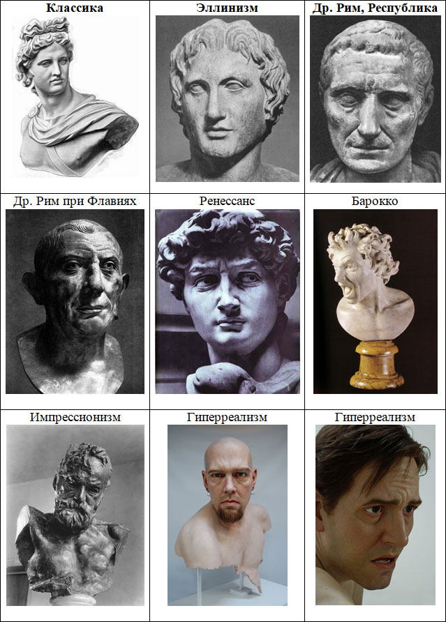 Портреты Брута, Цезаря, Помпея – одни из самых впечатляющих ранних шедевров искусства Древнего Рима, созданных в тот период, когда механицизм стал постепенно трансформироваться в мимесис под влиянием греческой культуры. Расцвет римского портрета приходится на тот момент, когда был найден баланс между механистическим телесным воспроизведением и воображением художника. Античный мимесис как принцип подражания творческой деятельности демиурга захватил римскую официальную культуру: император Август провозгласил главным принципом искусства греческую классику. Греческая тенденция идеализации и староримское направление реализма сосуществовали параллельно, и некоторые императоры, например, Флавии или Марк Аврелий поддерживали эту тенденцию и изображались реалистично, в отличие от Августа или Траяна. Похожие тенденции продолжают оставаться актуальными и в современном искусстве. В медиасфере работают античные принципы идеализации, только это уже не скульптура, а реальная трансформация тела (трансгрессия), которая сегодня стала доступна не только звездам. В элитарном галерейном искусстве гиперреализм противопоставляет медийной сфере натуралистическую тенденцию.