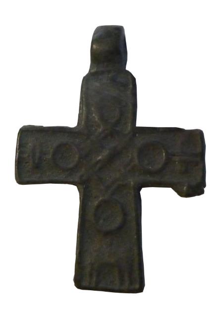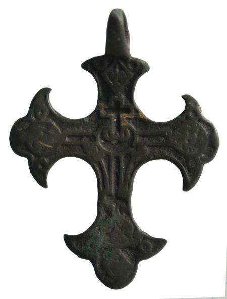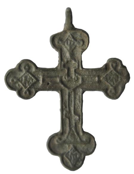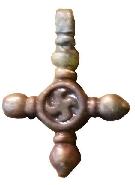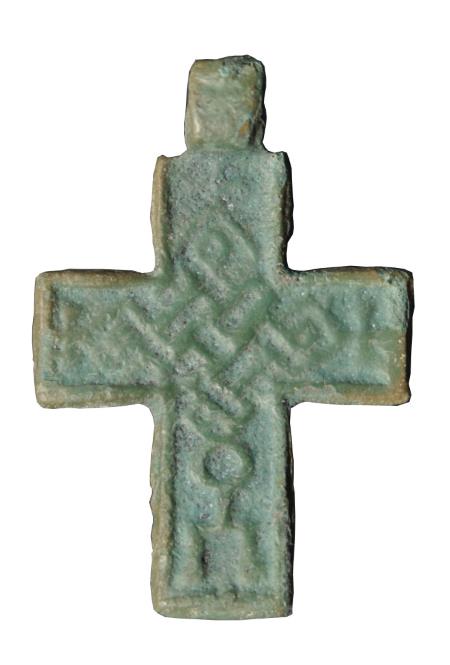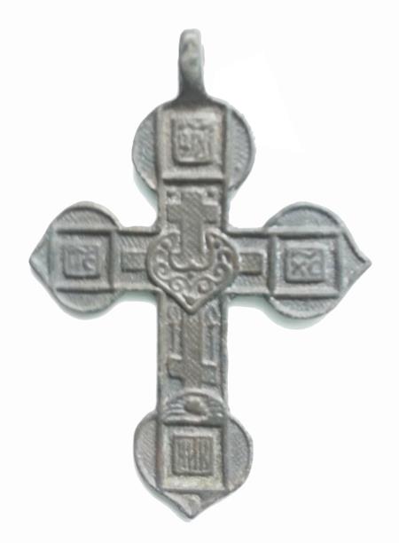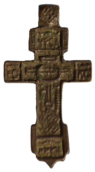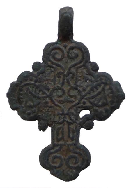 Например, на данном кресте в центре находится солярный свастический знак. На других крестах мы также в изобилии встречаем древние языческие символы. Подчеркнем, что речь идет не о каких-то особенных крестах, а о самых распространенных, нательных, т. е. тех, которые носили на шее практически все (Рис. 34—Рис. 36).
