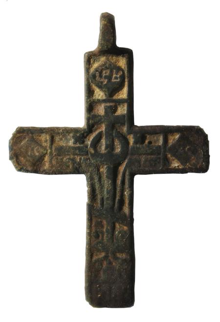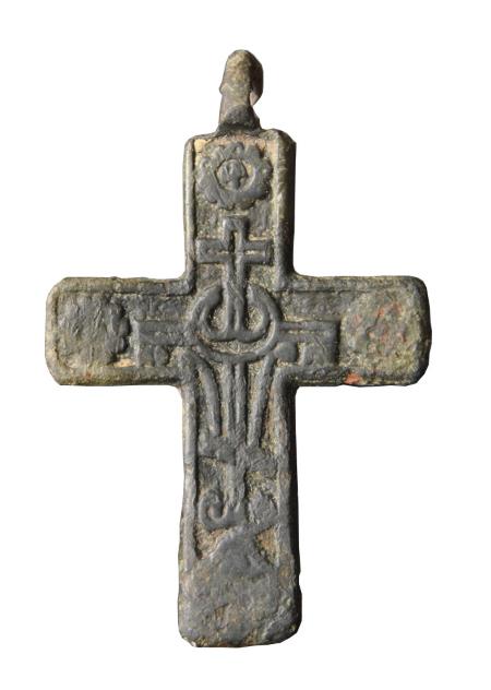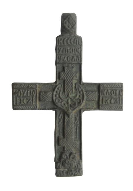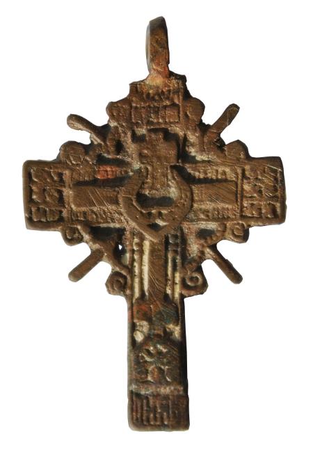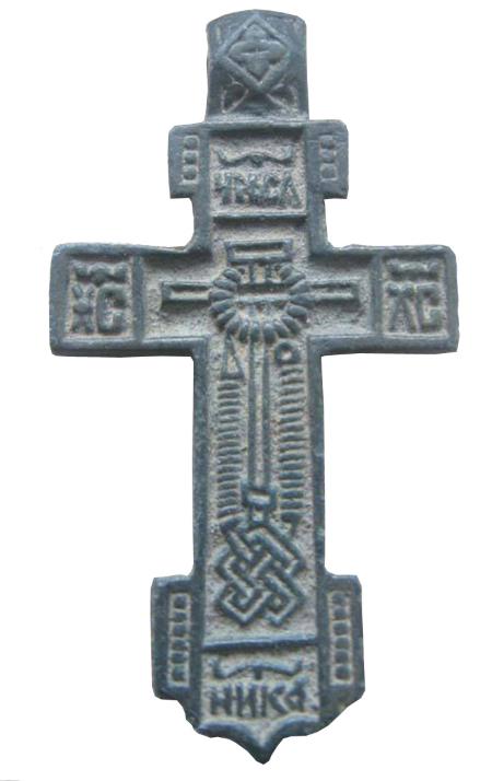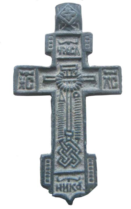 Таким образом, форма православного креста – это образ «лежащей на земле» нижней части «установки» для добычи священного огня, символа Рода, круглогодично открытой взорам соплеменников. Однако на нательных крестах данный образ снабжен и атрибутами действующей модели, такими, как «мерило праведное» и веревка. Думается, не в последнюю очередь это объяснялось трудностями в передаче на плоскости объемной фигуры. Поэтому изображали то, что видели на плоскости, а потом дополняли нужными деталями. В качестве такого дополнительного символа в центр, где должен был появиться священный огонь, помещали кресало, что недвусмысленно указывало: это именно то место, где должен появиться священный огонь. На ряде крестов даже изображались лучи, исходящие из центрального перекрестия.