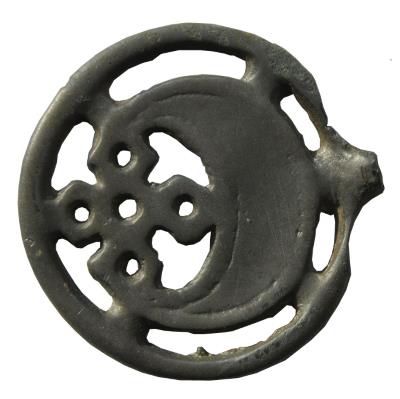 Однако при этом имеются в наличии и весьма странные лунницы, которые истолковать в качестве женских оберегов будет затруднительно. Дело в том, что эти лунницы, совмещены с изображением креста. Крест у таких артефактов помещен внутрь полумесяца – так, как это представлено на рисунках (Рис. 21—Рис. 24).