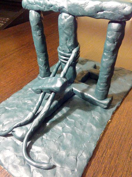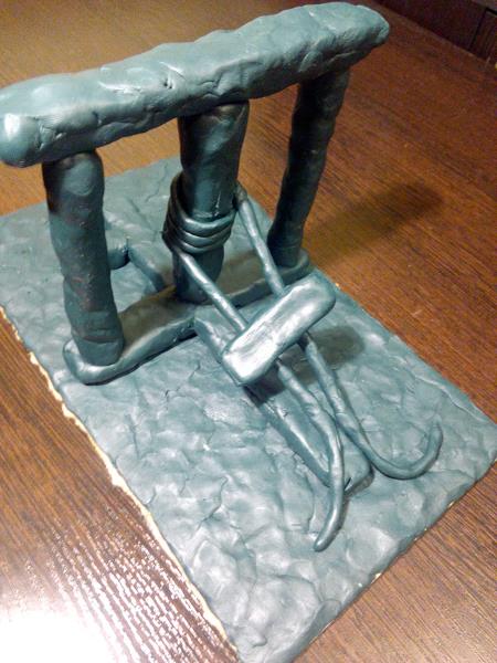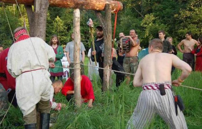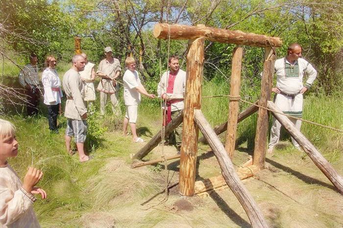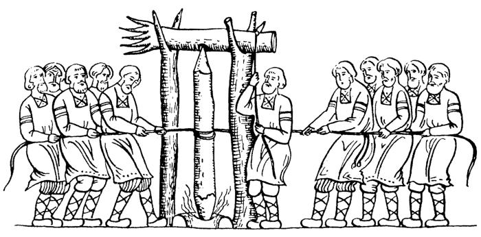 Далее. На реконструкции можно заметить, что концы веревки проходят через небольшую горизонтальную дощечку. Данная дощечка является ограничителем, который не позволяет веревке двигаться в одну сторону больше, чем в другую. Действительно, люди с одной стороны могли собраться более сильные, чем с другой. Во избежание перекосов и приделана данная дощечка. К ее концам крепится веревка, поэтому больше чем на длину этой дощечки веревку протянуть на себя невозможно. Кроме того, по ней можно отслеживать, на сколько повернулся центральный столб. Именно эта дощечка на православном кресте стала именоваться «мерилом праведным», поскольку ее присутствие нужно было хоть как-то объяснить. Верхняя, дополнительная перекладина на кресте нужна для того, чтобы гасить раскачивания вправо-влево (и диагональные перекосы) при вращении центрального столба. Вообще, с инженерной точки зрения, конструкция очень продуманная и устойчивая. К тому же, вероятнее всего, она была разборная. Нижняя часть (та, что «лежала» на земле), по-видимому, была стационарная, а верхнюю монтировали непосредственно перед ритуалом (так что название «Воздвижение креста» также не случайно). Во-первых, дерево съемной части должно было быть сухим и прочным, чтобы выдержать все нагрузки (не говоря уж о веревках). Во-вторых, сооружение могло просто мешать, т. к. располагалось посередине селения, на «центральной площади».