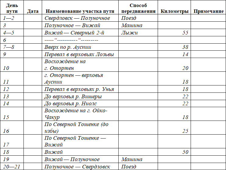 Вот каким был тот самый ориентировочный маршрут группы, если его изобразить с использованием таблицы той же формы, что и в проекте похода:
