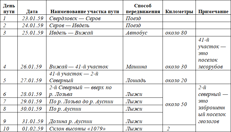 Итак, отмечаем для себя, что официальный срок возвращения группы, указанный в проекте похода, – 12 февраля 1959 года, а изначально группа планировала вернуться даже раньше, то есть 9 февраля 1959 года.