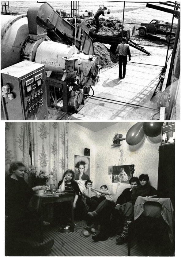 Наверху – тот самый агрегат витаминной муки АВМ-0,4 с ручной загрузкой зелёной массы. Внизу – типичная женская комната студенческого общежития 80-х. Фото из архива автора.