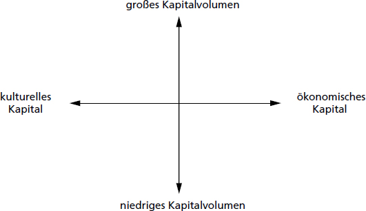 Soziale Felder und Feld der Macht: Soziale Felder stellen Räume dar, die sich aus einem Netz relativ zueinander stehender Positionen aufspannen und in Relation zu deren Kapitalvolumen stehen. Hierfür wird auf das kulturelle und das ökonomische Kapital Bezug genommen. Dies lässt sich in einem zweiachsigen Raum abbilden (siehe Abbildung 1).
