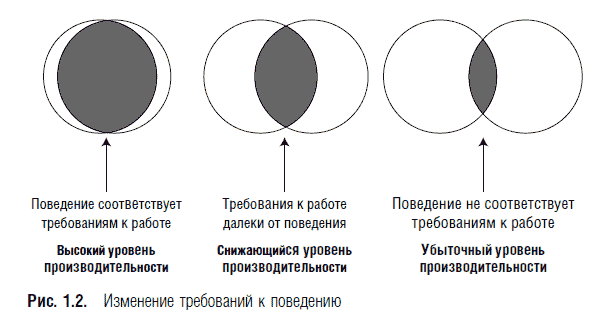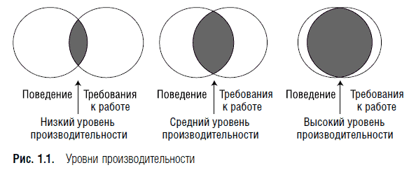 Эффективность работы каждого на рабочем месте, т. е. достижение высокой производительности, зависит от степени соответствия поведения моделям, необходимым для выполнения данной работы. Это проиллюстрировано на рис. 1.1. Чем больше зоны совпадения двух кругов, тем выше уровень производительности.