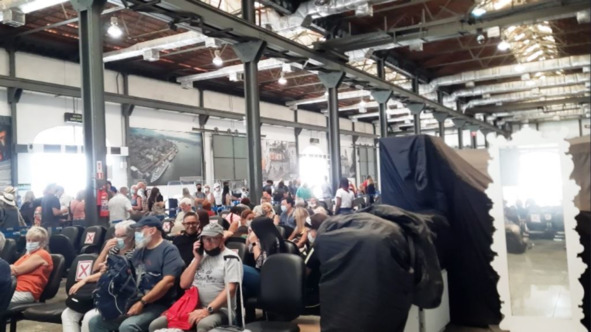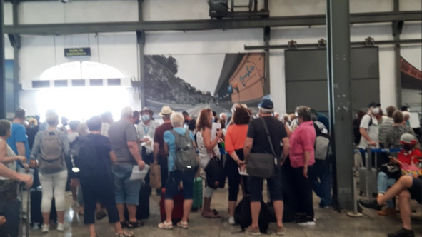 И пошли мы солнцем поджариваемые в палаточку бело-голубую где принимали пассажиров сдавших багаж. Подошла наша очередь, зашли в эту палаточку, ну думаем, сейчас быстренько на регистрацию. Прошли в помещение порта. Огромнейший ангар, метров 100 в глубину и море… Народу море. Не поверите, но правда море народу в этом ангаре, как бы соблюдаются меры санитарной безопасности с одной стороны, но человеки – битком, как факт с другой. Кто в масках, кто без масок, да и маски в этой «биткотне» были никуда. («Биткотня» производное от слова битком с добавлением остатка слова толкотня.). И кричат: «Белое, 9! Синее 12!» (по-португальски, а потом, слава богу по-английски). Ну прям биржа Нью – Йоркская. Оказывается, это выкрикивают номера наклеек для прохождения на регистрацию. И как вы думаете, какой в очереди стояло «красное 13»? Правильно угадали в начале конца. Такое казино.