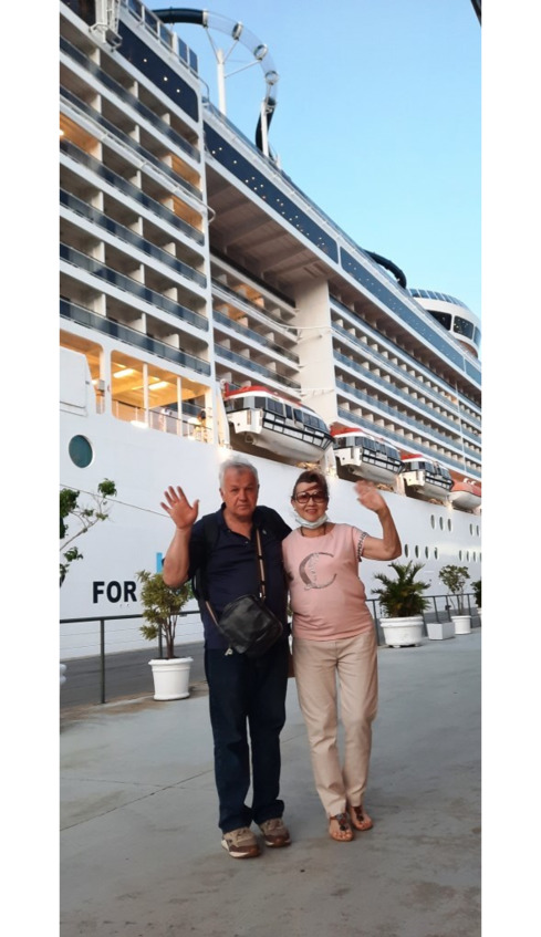 Ну посидели на стульчиках, подождали, повторно прошли ПЦР, несмотря на то, что мы только вчера его прошли, заплатив 80 долларов. Правда здесь уже не платили. Я спросил, что наш ПЦР не действителен? Нет, действителен, но Ваш ПЦР на 48 часов, а надо на 72. В правилах безоасности про это ни слова не было. Совершено странное объяснение, ведь с момента сдачи нами теста в сертифицированном медицинском центре не прошло и 24 часов. А здесь тест делал MSC. Экспресс – тест, в выделенном в ангаре закуточке, не отличавшемся стерильностью и у всех на виду. Создалось впечатление, что это такой отмыв денег. Надо списать тесты и показать, что компания беспокоится о туристах и является компанией номер 1 по борьбе с тестами. Наконец мы сдали паспорта. И тут на нас кончились какие-то бирочки, которые до ранее все наклеивали на грудь. С нами всегда так. «То жилет дырявый, то свисток без дырки». Пошли без бирочек. Но паспорта вернули. Прошли мы с Аминой Равильевной регистрацию. Вышли на волю, сфотографировались возле корабля. Радостно постукивая колесиками чемоданчика, пошли на посадку.