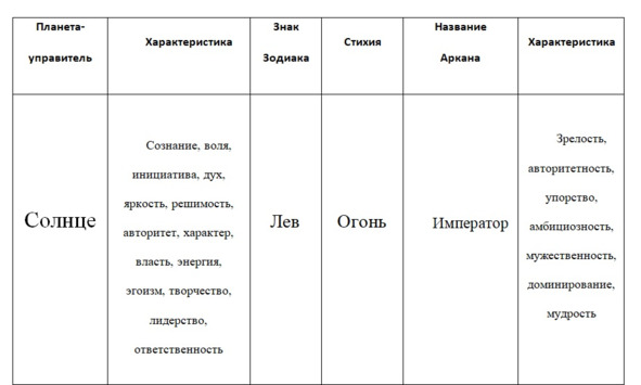 Старший аркан Таро Император является олицетворением власти, силы и авторитета. Это зрелый состоявшийся человек, убежденный в правоте своего мнения. Его жизнь подчинена строгому распорядку, позволяющему с помощью врожденного упорства и силы воли достичь намеченных целей. Он глава семьи и мудрый наставник для своих приближенных. Его разум преобладает над чувствами, и приоритет для него – процветание державы. Для поддержания своего авторитета ему необходимо неусыпно следить за делами государства, быть ответственным и контролирующим. Император – опытный руководитель, упрямый, но мудрый. Его решительность и сила помогают поддерживать порядок в государстве и укреплять границы. Вместе с этим, он отличный дипломат и знаток человеческой природы. Прямой обязанностью Императора считается забота о жизни подданных и защита границ государства. Аркан Император ассоциируется с архетипом отца. Он является супругом Императрицы. Император – творец, творческая натура. Поэтому для данного аркана был выбран знак Зодиака Лев, планетой-управителем которого является Солнце.