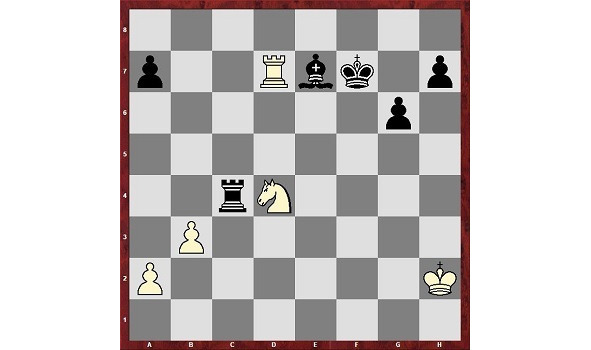 Вскоре Эбралидзе сделал ещё одну грубую ошибку: 41. … Сf6 42. Кb5 Лc2+43. Крg3 a6 44. Лd7+ Крe8 45. Лc7?? Сe5+