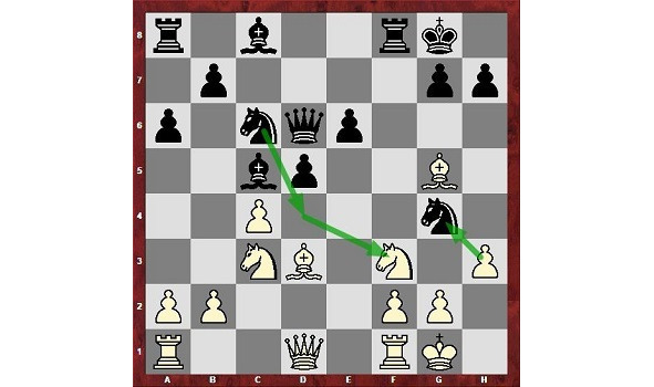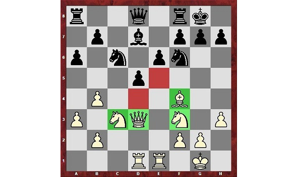 Белые подтянули к центру 4 свои фигуры. Следующим ходом они готовы пойти конем на е5. Такого коня в центре терпеть нельзя, а если черные разменяются, то на поле е5 перейдет белый слон, который нацелится на черного короля.