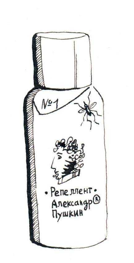 И протянул (наезд камеры) белый флакончик с хорошо знакомой зрителям чёрной завитушкой подписи и профилем, выполненным одним штрихом гусиного пера. «Репеллент Александр Пушкин». На фоне молодой зеленеющей листвы побежали по экрану знакомые строки: