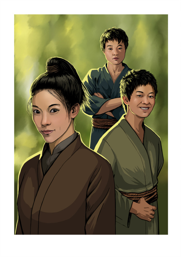 Далее парни-незнакомцы, один из которых оказался девушкой, быстро взяли Лин, Лана и Квана в оборот – в ближайшей роще отобрали у них верхние шёлковые парадные одежды и безжалостно сожгли. А взамен выдали неопределённого цвета потёртые шаровары и рубахи, упругие сандалии из твёрдой соломы, конические шляпы, скрывающие лица, скатанные циновки, деревянные миски, короткие железные ножи и тяжёлые посохи из твёрдого коричневого дерева.