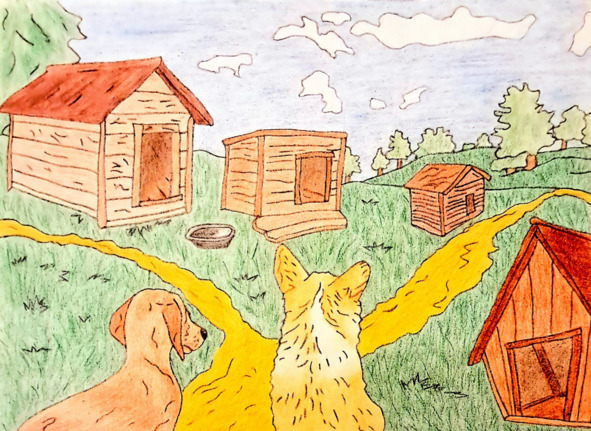 Уже через несколько минут Берта и Дорис подошли к просторному дворику, окружённому чем-то вроде заборчика из невысоких кустиков. По всему дворику стояло множество пеньков, вокруг которых толклись разные собаки.