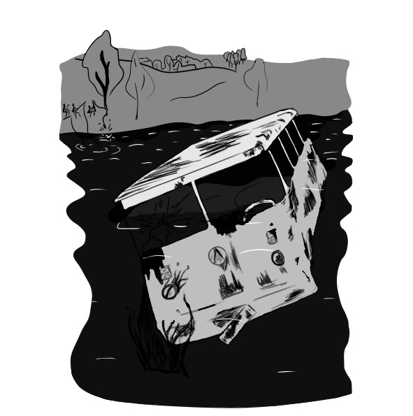 Зелёная, мутная вода. Сквозь толщу её просвечивают косые солнечные лучи. В этих лучах медленно кружатся, парят какие-то обрывки водорослей, муть, поднятая со дна, пузырьки воздуха… Ближе ко дну солнце почти не проникает, тут сумрачно и холодно. Виднеется когда-то высокая, а сейчас размытая, провалившаяся, почти бесформенная насыпь. Начало и конец её не видны, скрываются в зеленом сумраке воды. По краю насыпи стоят деревянные столбики, обозначающие её край. Когда-то гладко оструганные, с заостренным верхом, выкрашенные в черную и белую косую полоски, сейчас они одинаково темно-зеленые, покосившиеся, но стойко несущие свою вахту: много десятилетий обозначают обрез дороги, по которой никто не поедет. Темной тушей привалился к одному из столбов, уперся колесом автобус. Марки не разобрать, кузов покрыт илом и водорослями, верхние стекла открыты- тем летом стояла страшная жара. Дверь раскрыта, на потертом сиденье водителя лежит ржавая монтировка, толстый рыхлый прут ржавчины. На панели, в углублении, угадываются припорошенные илом монеты…