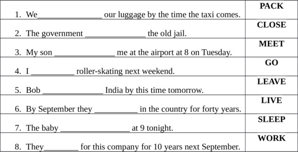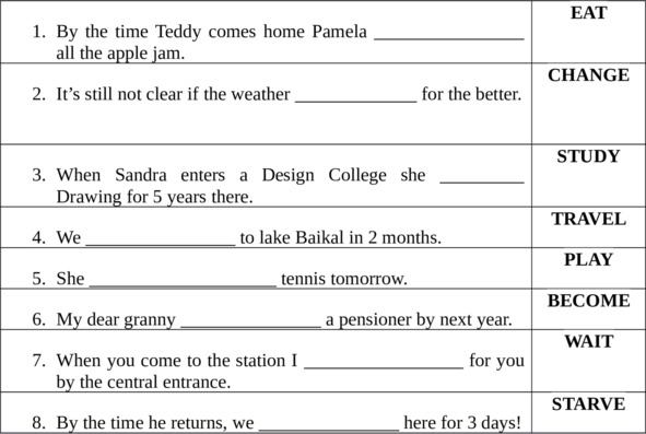 Упражнение 2. Поставьте глагол в форму Future Simple, Future Continuous, Future Perfect или Future Perfect Continuous. Сделайте предложения отрицательными и вопросительными.