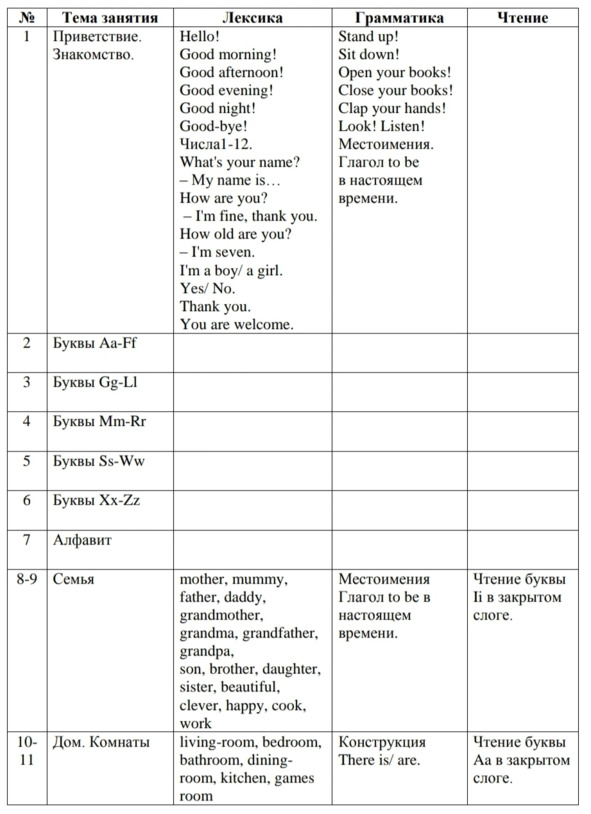 Программа рассчитана на 60 занятий (в неделю 2 занятия по 45 минут). Рекомендую начать занятия со второй недели сентября.