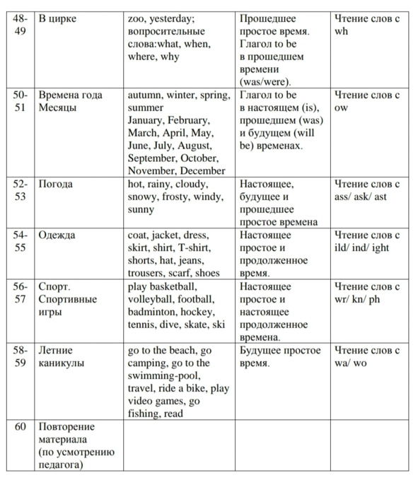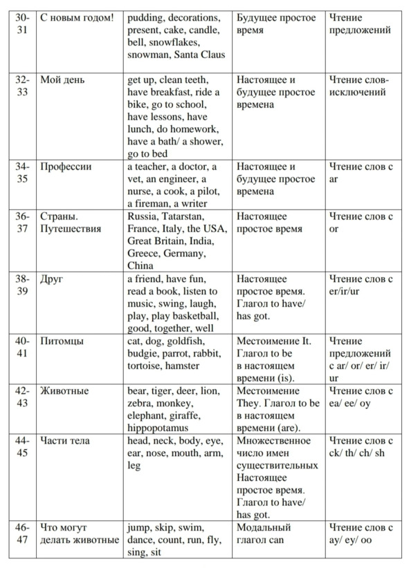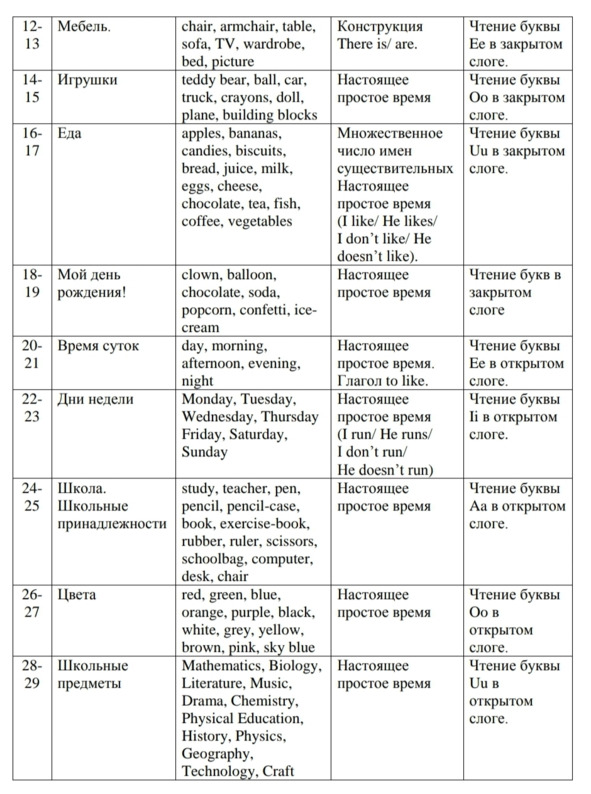 «Знакомство», «Я и моя семья», «Мир моих увлечений», «Я и мои друзья», «Моя школа», «Мир вокруг меня», «Страна/страны изучаемого языка и родная страна»