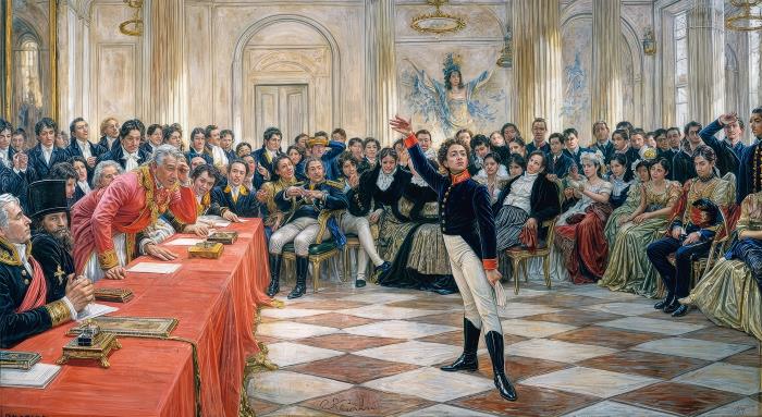 Кроме общения с замечательными преподавателями, в Лицее можно было прикоснуться к великому в прямом смысле этого выражения – во время приезда этих самых великих на аттестационные экзамены. Самое известное событие этого рода, запечатленное, в том числе, на картине Репина, – посещение «публичного испытания» в январе 1815 года Гавриилом Романовичем Державиным. Ему шел 72-й год – по нашим меркам, вполне можно баллотироваться в президенты, но тогда в таких летах[25] надлежало быть дряхлым и глуховатым. Таким – скучным и спящим, он и сидел во время экзамена, пока выступление Пушкина не заставило его встрепенуться (далеко не факт, что нас сегодняшних то пушкинское стихотворение – «Воспоминания в Царском Селе» – взбодрит так же, как Державина). Пушкин пронзил классика своим словом, будто копьем. Как в эпизоде Крещения Христа поступило четкое указание сверху «Сей есть сын мой», так и здесь Державин указал на того, кто идет следом и кого река времен унести не в состоянии…