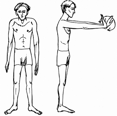 3. Руки – вперед. Вращение кистей по часовой и против часовой стрелки. Не опуская рук, «натягиваем» кисти рук «на себя». Пальцы держи прямо! Теперь кисти сгибаются вниз («смотрят» в пол). Пусть напрягается предплечье. Эти мышцы работают очень часто, поэтому крепкие предплечья пригодятся любому.