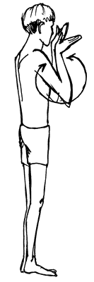 4. Теперь давай сделаем «жернов». Это вращение локтями. Кисти рук при этом описывают круги. Со стороны кажется, что мы вращаем жернов. Веселое упражнение.