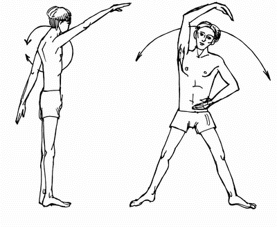 6. Теперь расставим ноги на двойную ширину плеч. Полусогнутая правая рука – над головой. Совершаем двойные наклоны в левую сторону – первый полегче, мягкий; второй – глубже и интенсивнее. Сразу меняем руки и «кланяемся» вправо. Повторы делай по своему усмотрению.