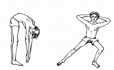 7. Двойной наклон вперед. Коленки не гнутся, вся нагрузка – на спину. Первый наклон – мягкий и неглубокий; второй – глубже и энергичнее, как в предыдущем упражнении. Сразу же за наклонами следует мягкий, но качественный прогиб назад. И так несколько раз…
