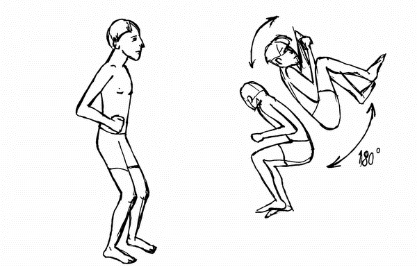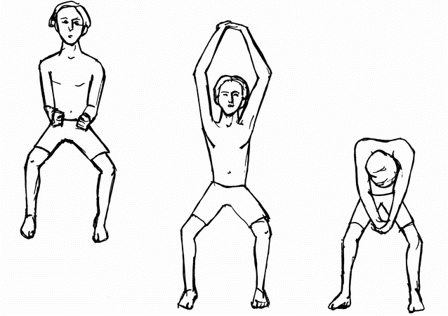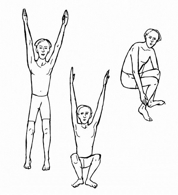 Встань прямо, руки подними вверх, ладони застыли над головой. Глубоко присядь и тут же выпрыгни вперед, резко выдохнув. Прыгать нужно с таким расчетом, чтобы твои ноги вынесло вперед, перед корпусом. В тот краткий момент, когда они застынут в воздухе, постарайся успеть хлопнуть ладонями по лодыжкам. Как можно громче. И главное – успеть вернуться в исходное положение, иначе вероятность приземлиться на «пятую точку опоры» будет очень большой.