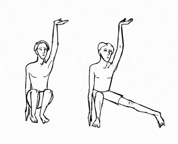 Упражнение третье: «Нога-крюк вращается вдоль земли – сохраняй равновесие». Это практически подсечка. Вернее, подготовительное упражнение к этому непростому приему. А выполняется это мудреное упражнение так: приседаем сразу на обе ноги, правую руку выпрямляем над головой, центр ладони «смотрит» в потолок; левую руку опускаем к полу, однако не ставим на него. Центр ладошки обращен к полу. Рука – прямая. Левая нога вытягивается вдоль пола в сторону и назад, носок подтягивается вовнутрь, к себе, стопа полностью лежит на земле. Теперь энергично, но плавно «скользим» левой ногой вперед, пока носок не окажется прямо впереди. Корпус при этом остается на одном месте – двигается только нога! Когда нога окажется впереди, подтягиваем ее под себя, в исходное положение. Повтори разика три, затем поменяй ноги. Да старайся, чтобы корпус не раскачивался, как флюгер на ветру, а сама нога не сгибалась в колене.