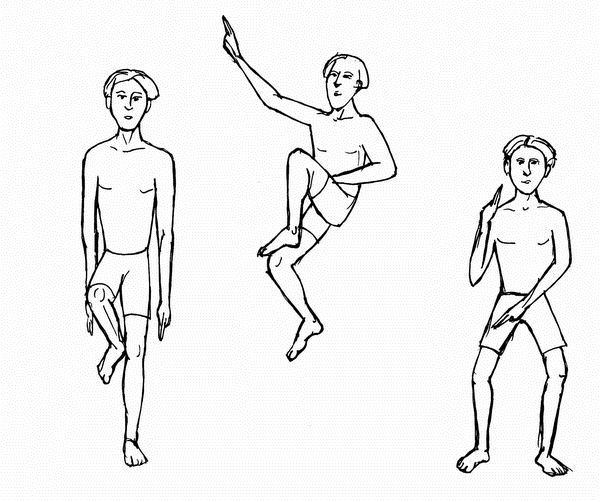Встань прямо. Руки разведи в стороны и согни в локтях так, чтобы кулаки практически прижимались к ушам. Центры кулаков, то есть ладонная часть, обращены вверх. Левую ногу подтяни к колену правой, носок загибается вовнутрь, образуя крюк. Такая вот своеобразная стойка на одной ноге. Теперь попробуй наклониться вправо, при этом кулаки бьют вперед, над головой, а левая нога распрямляется в сторону. Не так-то просто это сделать, учитывая, что при этом желательно сохранить равновесие. Вначале удары кулаками и ногой можно делать медленно, но так как это все-таки удары, скорость и резкость движений стоит постепенно увеличивать. После удара ногой и кулаками можно застыть на минутку-другую в наклоне, с согнутой в колене левой ногой и подтянутыми к ушам кулаками. Попробуй проделать этот фокус разика три-четыре, затем смени ноги.