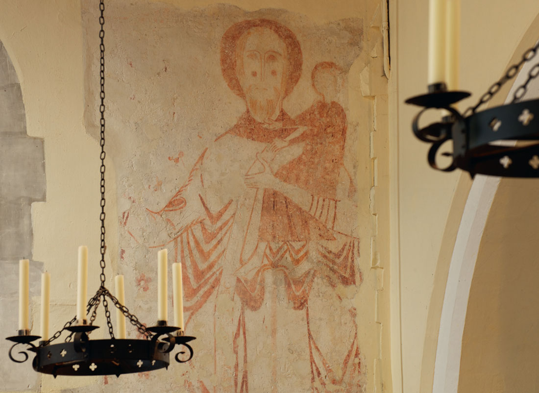 WEST HORSLEY: ST MARY – St Christopher carrying an infant Christ on his shoulder was a common theme for medieval wall-paintings; this one could be as early as 13th-century