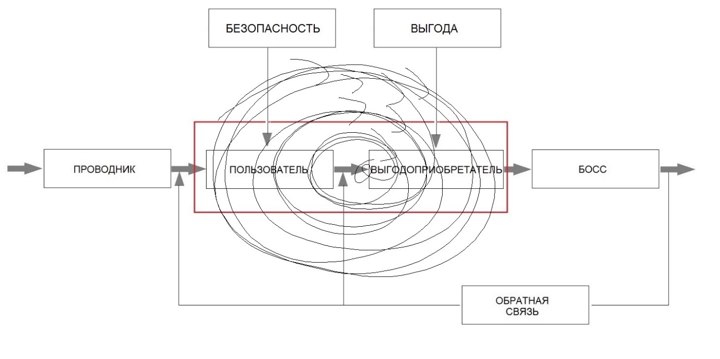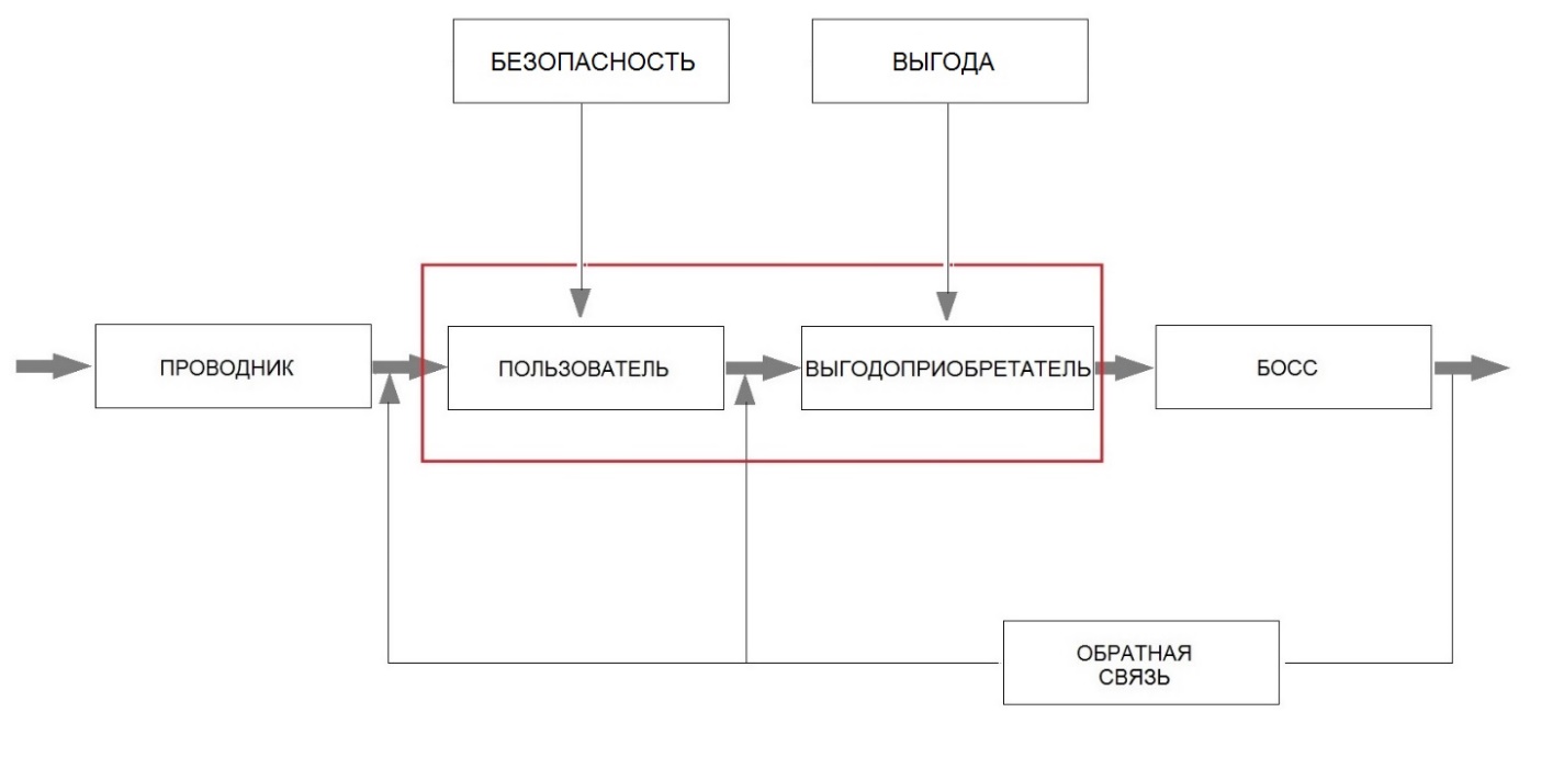 «Вот так вот просто?!» – воскликнут те, кому надо продать. Нет, не просто. Зато технологично. Пользователь – Выгодоприобретатель, потом опять Пользователь – Выгодоприобретатель. Эти две роли на рис. 1 специально находятся в красном прямоугольнике. Допустим, вы нашли выгоду и получили подтверждение у Выгодоприобретателя, что она для него существенная: «…да, нам действительно нужен более скоростной ускоритель альфа-частиц, иначе мы не справляемся с производственным планом». Теперь у вас в руках есть «рычаг». Предстоит второй заход к Пользователям, чтобы (и это ваша цель) еще больше снизить уровень их тревожности, предлагая дальнейшие шаги, уже с помощью «рычага», полученного от Выгодоприобретателя: «…вам же нужен более скоростной ускоритель альфа-частиц, вы не против, если?..» И вновь процесс достаточно технологичный. Напоминает запуск двигателя после многолетнего простоя: капнуть масла – покрутить, еще капнуть – еще покрутить, и так много раз, без малейшей потери энтузиазма.