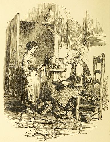 “Hardly had Mr. Peg got the soles and the upper leathers and the vamps to his mind, and sat down on his chair to begin work, when a little girl came in. She came from a door that opened upon a staircase leading to the upper room, and walked up to the cobbler. It was a little brown-haired girl, about nine or ten years old, in an old calico frock and pantalettes; she was not becomingly dressed, and she did not look very well.