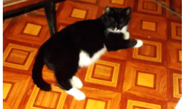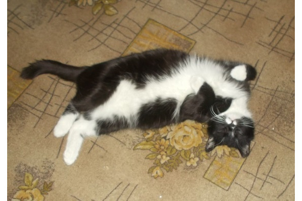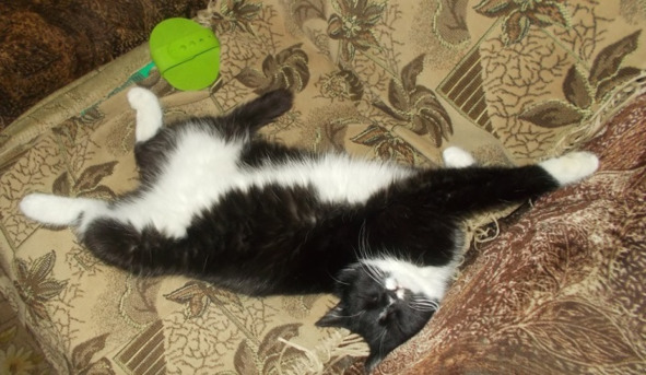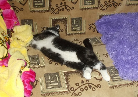 На одеяле и простыне были нарисованы большие грозные тигры, куда не посмотришь, везде эти полосатые чудовища. А я всего лишь маленький черный кот. И я их не боюсь, потому что я настоящий, живой, а они только лишь нарисованы. И я на них лежу, растянувшись в тепле и уюте. Перевернулся на спину, растянулся и лежу.