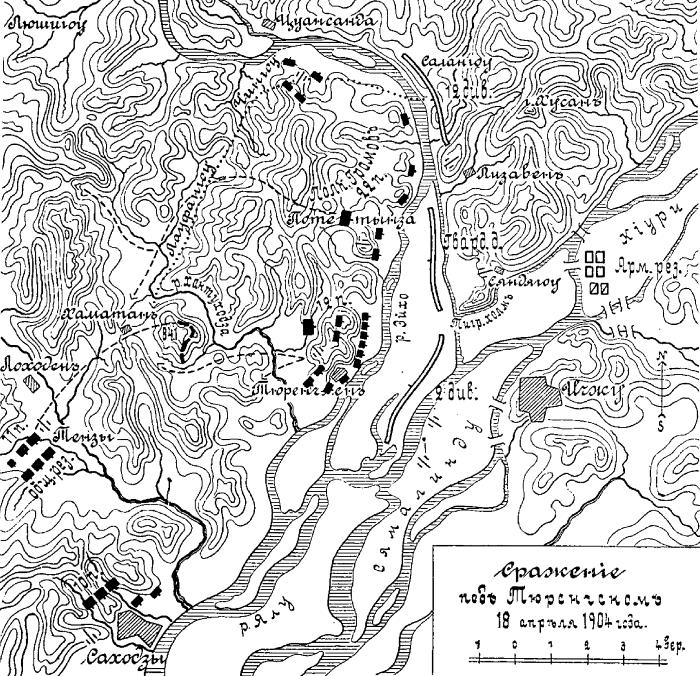 Японская армия к утру 18 апреля развернулась, следующим образом: 12‑я дивизия продвинулась до Эйхо[2] на участок Салангоу – Лизавен. Гвардия и 2‑я дивизия перешли Ялу против Тигрового холма, и затем, переменив фронт налево, развернулись – гвардия от Лизавена до Тигрового холма, а 12‑я дивизия – южнее, фронтом к селению Тюренчен. Артиллерия 12‑й дивизии группировалась у Лизавена, гвардии – у Сандягоу, 2‑й дивизии – частью оставалась, вместе с гаубицами, на острове Сямолинду, а 3 батареи были переправлены на понтонах на ближнюю позицию к с. Матуцао.
