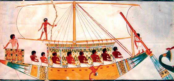 С укреплением Египетского царства изменился и вырос флот этой державы – появились корабли различного назначения: боевые, торговые, или просто транспортные, на которых, в частности, доставляли к месту назначения каменные глыбы для монументального строительства. Примерно между 3000–2778 годами до нашей эры в Египте строится первая достоверно известная верфь. О том, насколько было развито судоходство, можно судить по тому, что среди семи жестко разграниченных каст египетского общества мы встречаем две, имеющие прямое отношение к мореплаванию – кормчие и толмачи.