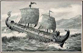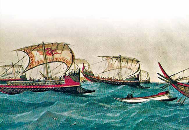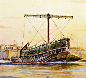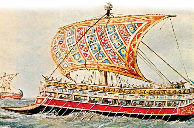 Потому основным движителем все еще оставались весла. Для дальних плаваний необходима была не только изрядная сила гребцов, но и координация их действий. Специально для поддержания ритма на кораблях появляются музыканты, играющие на флейтах и барабанах.