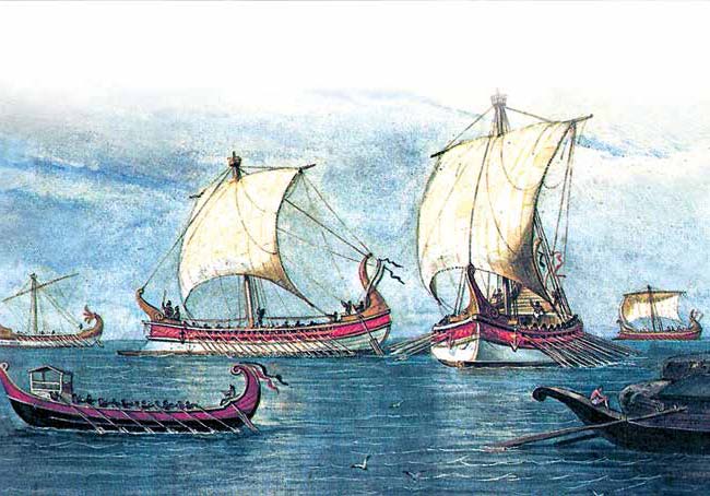 Их место уверенно заняли все те же финикийцы, у которых не было плодородной долины Нила, дававшей все необходимое. Суровая борьба за выживание, а затем и неутолимая жажда наживы гнали их все дальше от родных берегов. По поводу их флота трудно утверждать что-нибудь достоверно, поскольку дошедшие до нас изображения на монетах или вырезанные картины на камне, весьма схематичны, и по своему замыслу носят скорее символический, нежели документальный характер. Кое-что из дошедшей до нас информации все же представляется несомненным.