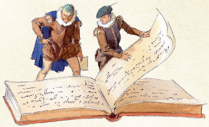 Один чиновник громко читал опись, а другой бегал по Гулливеру из кармана в карман и показывал ему, какие вещи нужно доставать.