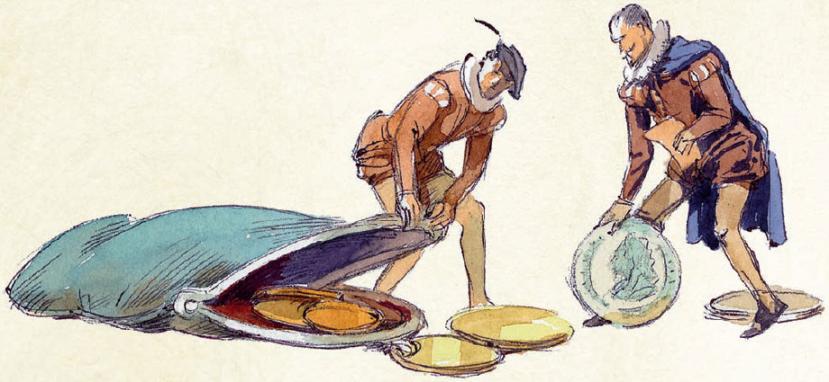 6. В левом верхнем кармане жилета мы нашли сеть размерами не менее рыболовной, но устроенную так, что она может закрываться и открываться наподобие кошелька. В ней лежит несколько тяжелых предметов из красного, белого и желтого металла. Они разной величины, но одинаковой формы – круглые и плоские. Красные – вероятно, из меди. Они так тяжелы, что мы вдвоем едва могли поднять такой диск. Белые – очевидно, серебряные – поменьше. Они похожи на щиты наших воинов. Желтые – должно быть, золотые. Они немногим больше наших тарелок, но очень увесисты. Если только это настоящее золото, то они должны стоить очень дорого.