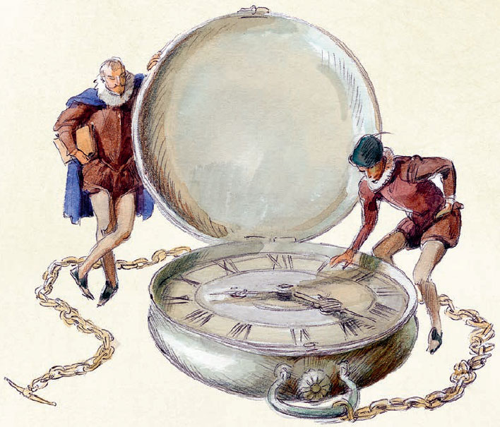 Внутри этого круглого предмета, очевидно, сидит какое-то таинственное существо, которое не переставая стучит не то зубами, не то хвостом. Человек-Гора объяснил нам – частью словами, а частью движениями рук, – что без этого круглого металлического ящика он бы не знал, когда ему вставать утром и когда ложиться вечером, когда начинать работу и когда ее кончать.