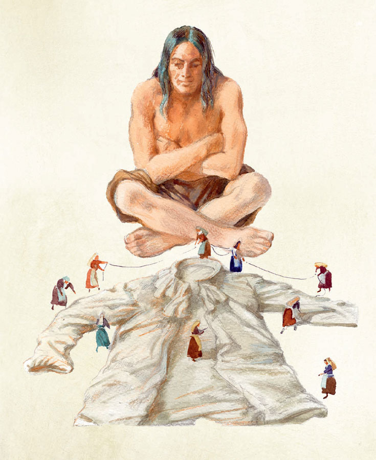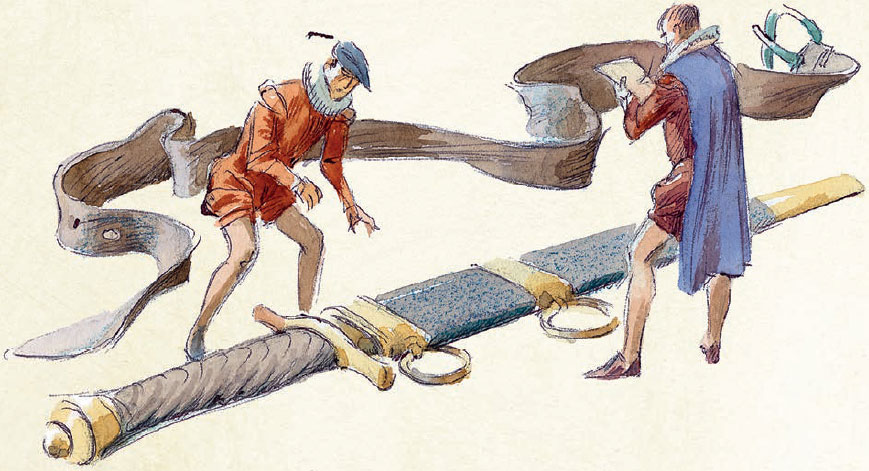 Белошвейки сняли с Гулливера мерку, когда он лежал в постели. Одна из них встала ему на шею, другая на колено. Они взяли за концы длинную веревку и туго натянули ее, а третья швея маленькой линеечкой измерила длину этой веревки.