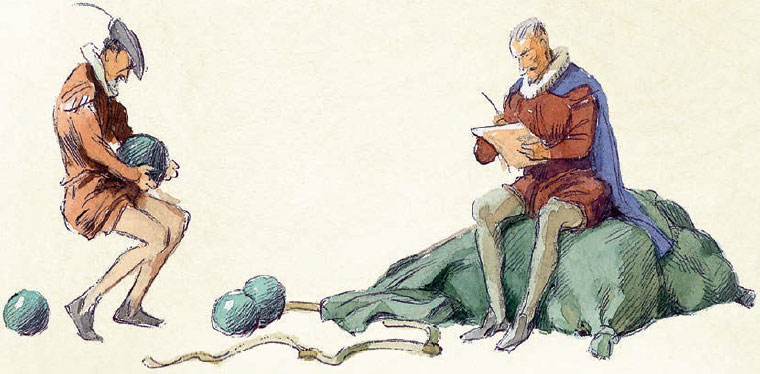 – Кожаный пояс, меч, двойной мешок с металлическими шарами в одном отделении и черными зернами – в другом!