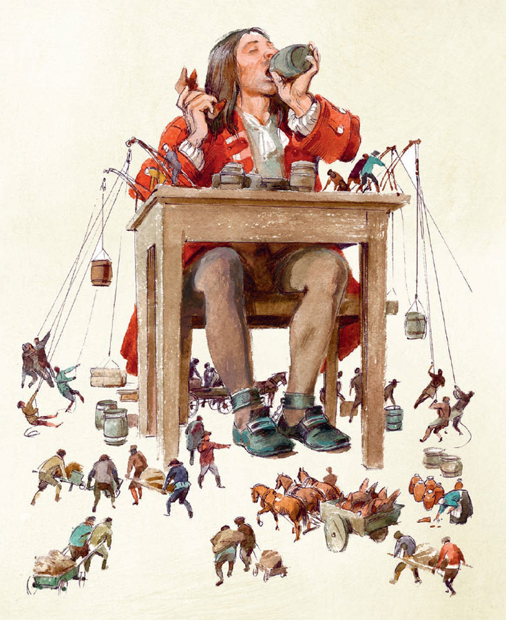 Двадцать человечков Гулливер брал в руки и ставил прямо к себе на стол. Остальные сто работали внизу. Одни подвозили кушанья в тачках или подносили на носилках, другие подкатывали к ножке стола бочки с вином.
