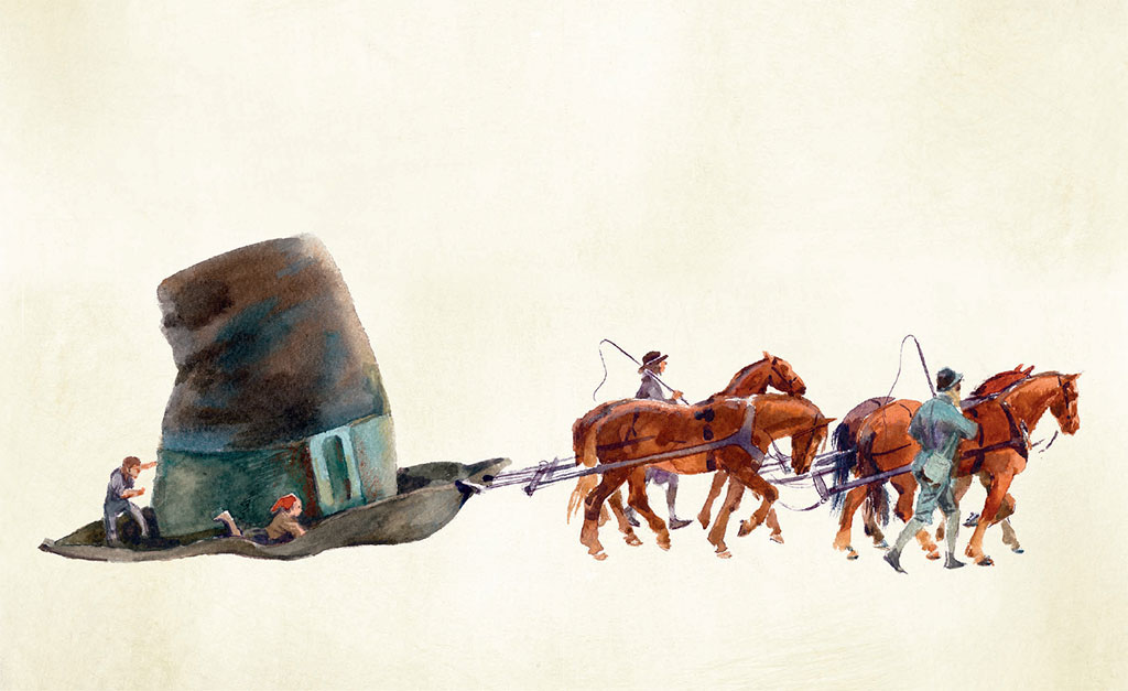 На другой день семь возчиков на семи телегах доставили ему бревна. Каждую телегу тянуло восемь лошадей, хотя бревна были толщиной в обыкновенную тросточку.