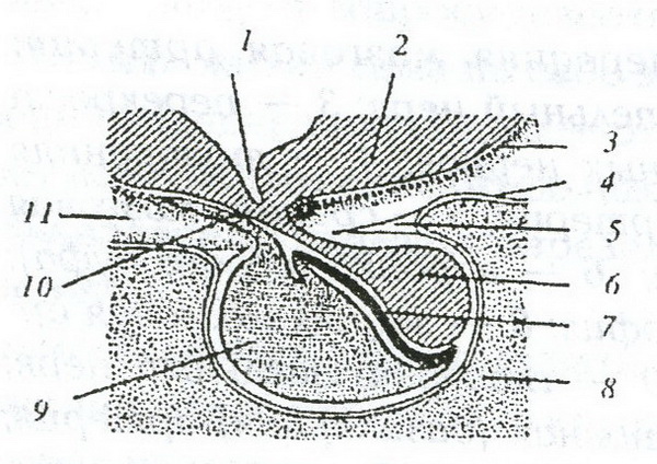 8 – промежуточная и 9 – передняя доля гипофиза;