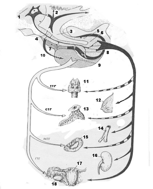 Рис. 8. Действительные (черные стрелки) и предполагаемые (прерывистые стрелки) пути распространения и направления воздействия нейрогормонов, вырабатываемых нейросекреторными клетками гипоталамуса, а также тронных гормонов (белые стрелки) (по А. Л. Поленову).
