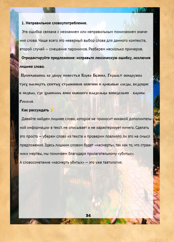 Этот вид ошибок встречается еще реже. Ошибка связана с нарушением единства текста, когда в одном предложении присутствуют слова из разных стилей. Например, в публицистику добавляют термины, канцеляризмы, просторечия и т. д. В нейтральной лексике не должно быть разговорных и просторечных выражений. Их мы сразу убираем: облапошить, не догнал (в значении «не понял»), морда, хата, паршиво, сдуру… Не сочетаются в нормальной лексике разные канцеляризмы: имело место быть, основным содержанием которого, в течение неопределенного срока, вышеуказанный, в данный момент…