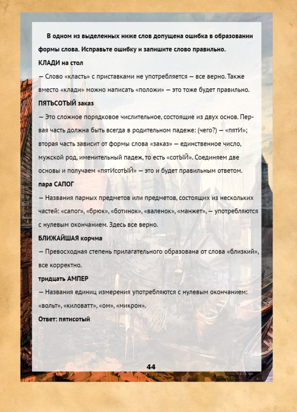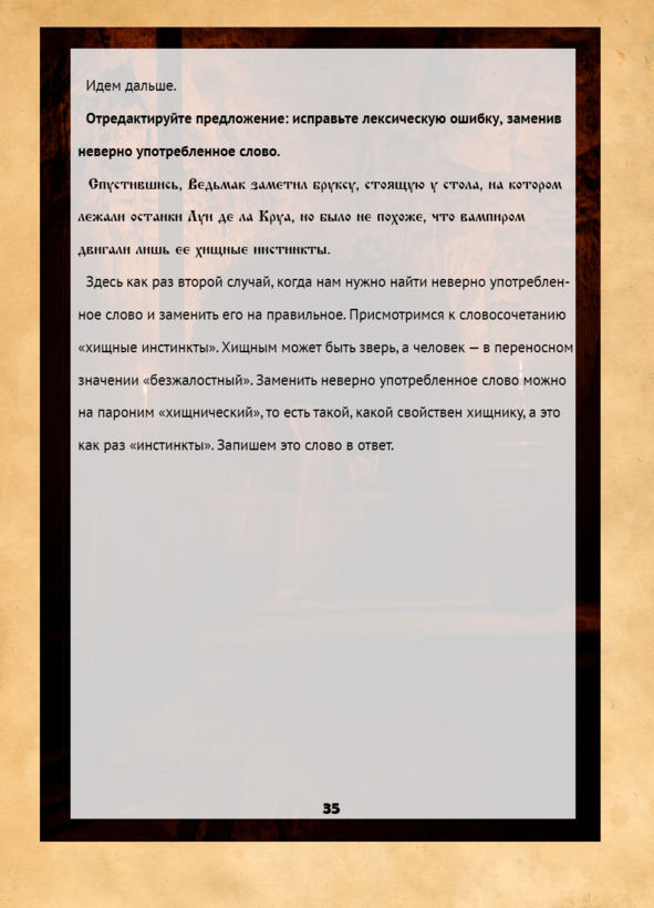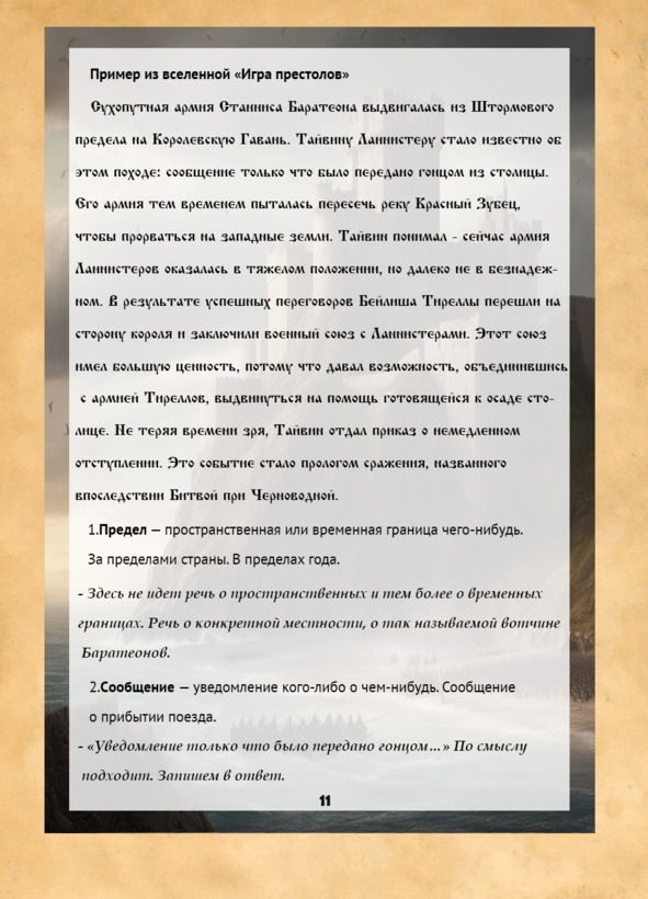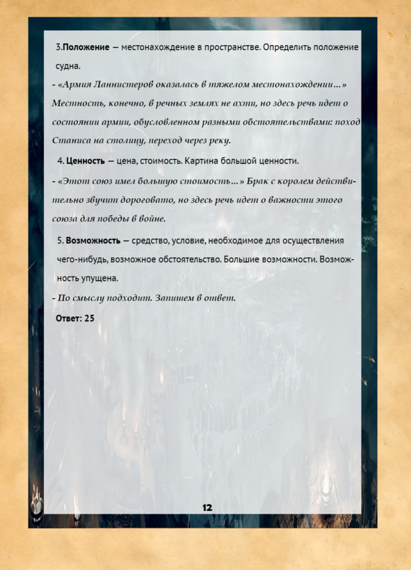 С другой стороны, каждый раз, садясь за зубрежку, быстро устаешь и теряешь концентрацию. Нет этого погружения и чувства чего-то знакомого и приятного. Эта книга решит эту проблему. Она хорошо объясняет всю тестовую часть, а также содержит примеры из известных произведений фэнтези: «Ведьмак», «Игра престолов», «Властелин колец». Это поможет в изучении материала, и время, выделенное для подготовки, будет идти в совсем другом, размеренном и спокойном темпе. Помню, я сам, чтобы отвлечься от судорожного заучивания всего нужного и ненужного, время от времени поигрывал в «Ведьмака», и это помогало справиться со стрессом и чувством безысходности. Кстати, ЕГЭ тогда я сдал на 98 баллов, выполнив безошибочно всю тестовую часть. Чего и вам желаю.